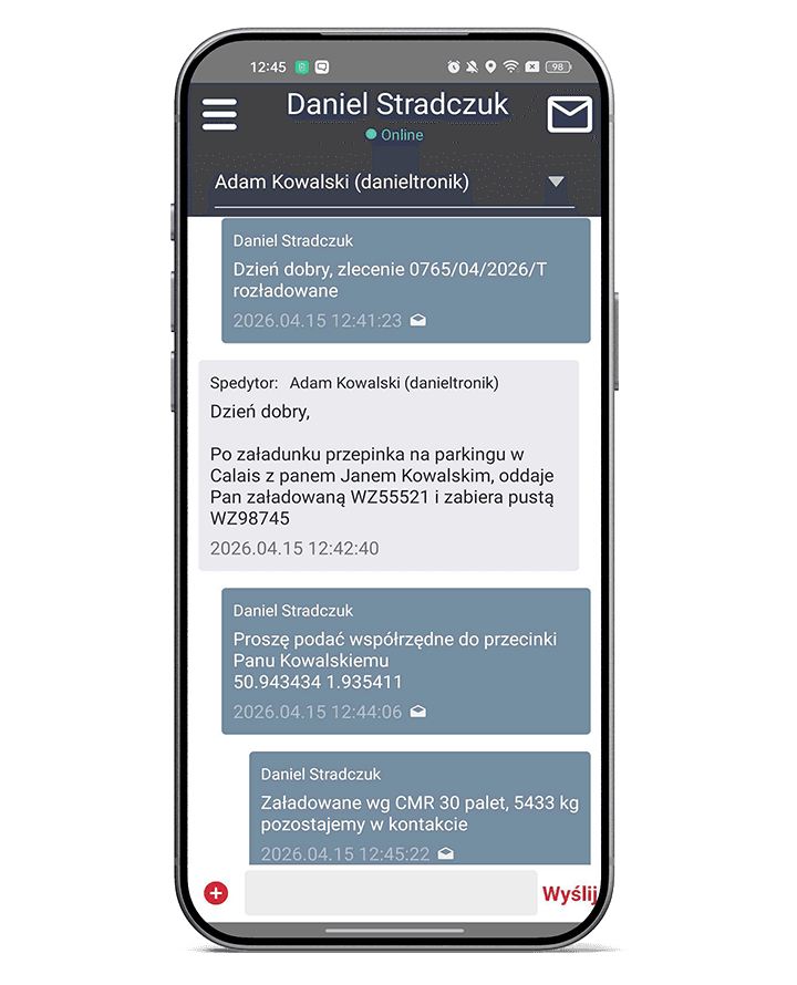 Dyspozytor może komunikować się z kierowcą także poza biurem, a cała wymiana informacji pozostaje dostępna w jednym środowisku. To ułatwia codzienną pracę, ogranicza chaos komunikacyjny i zwiększa kontrolę nad realizacją transportu.