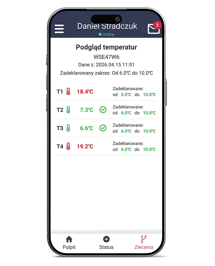 Kierowca widzi podgląd online na temperaturę panującą w jego naczepie, a także dostaję alerty w razie spadków temperatury.