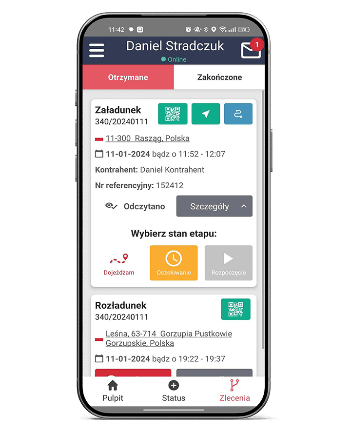 Kierowca ma stały dostęp do zleceń, tras i kluczowych informacji potrzebnych do realizacji transportu.